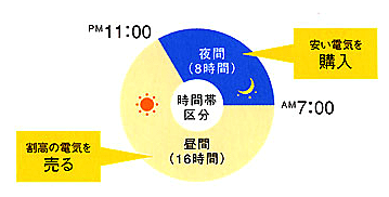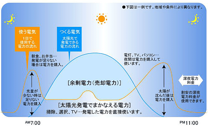 昼間発電して使い、余った電気は電力会社に売り、雨の日や夜など、発電量が足りない時や発電しない時は従来通り電力会社から購入。電力会社との系統連携により、電気料金を節約できます。又、節電意識も高まります。